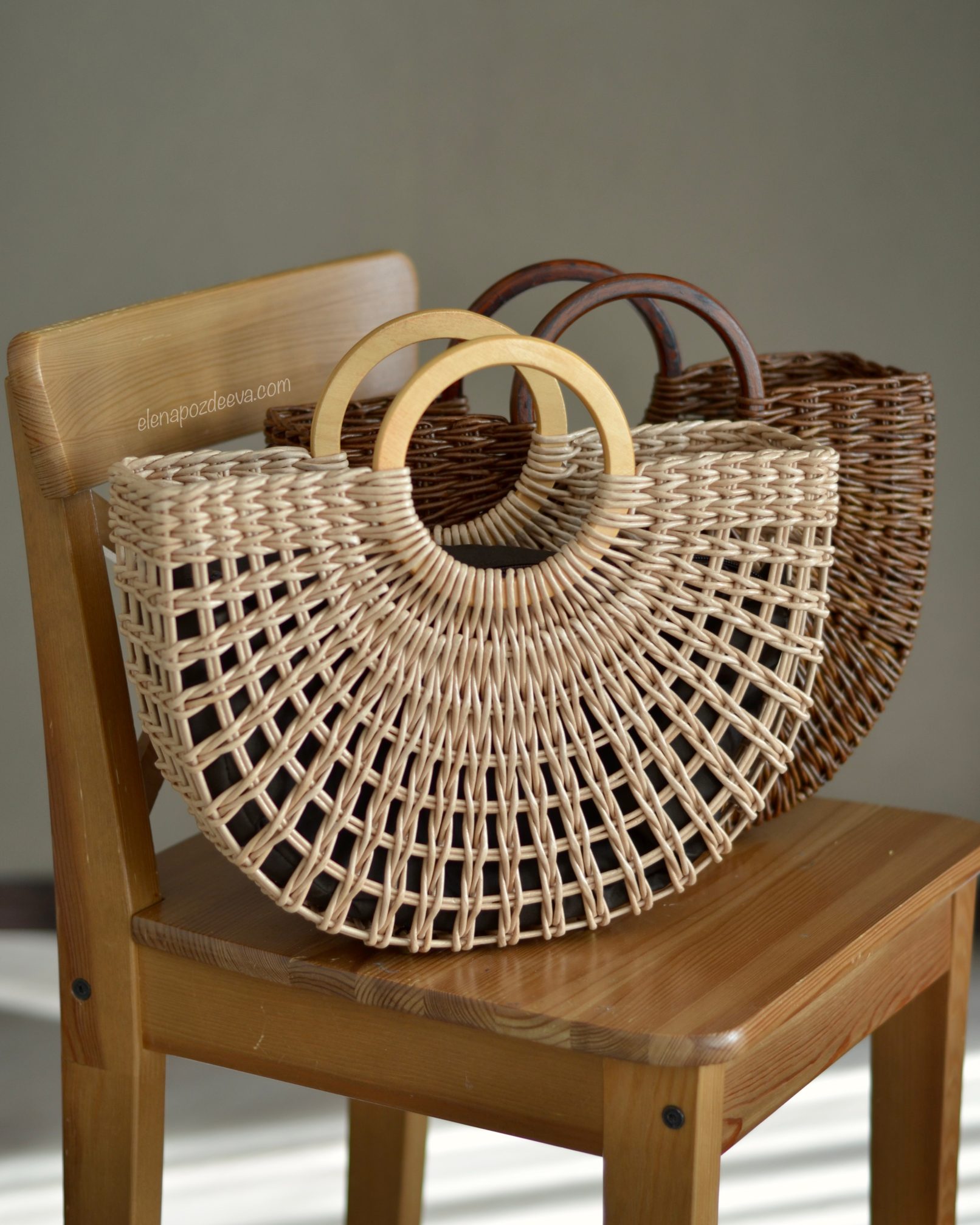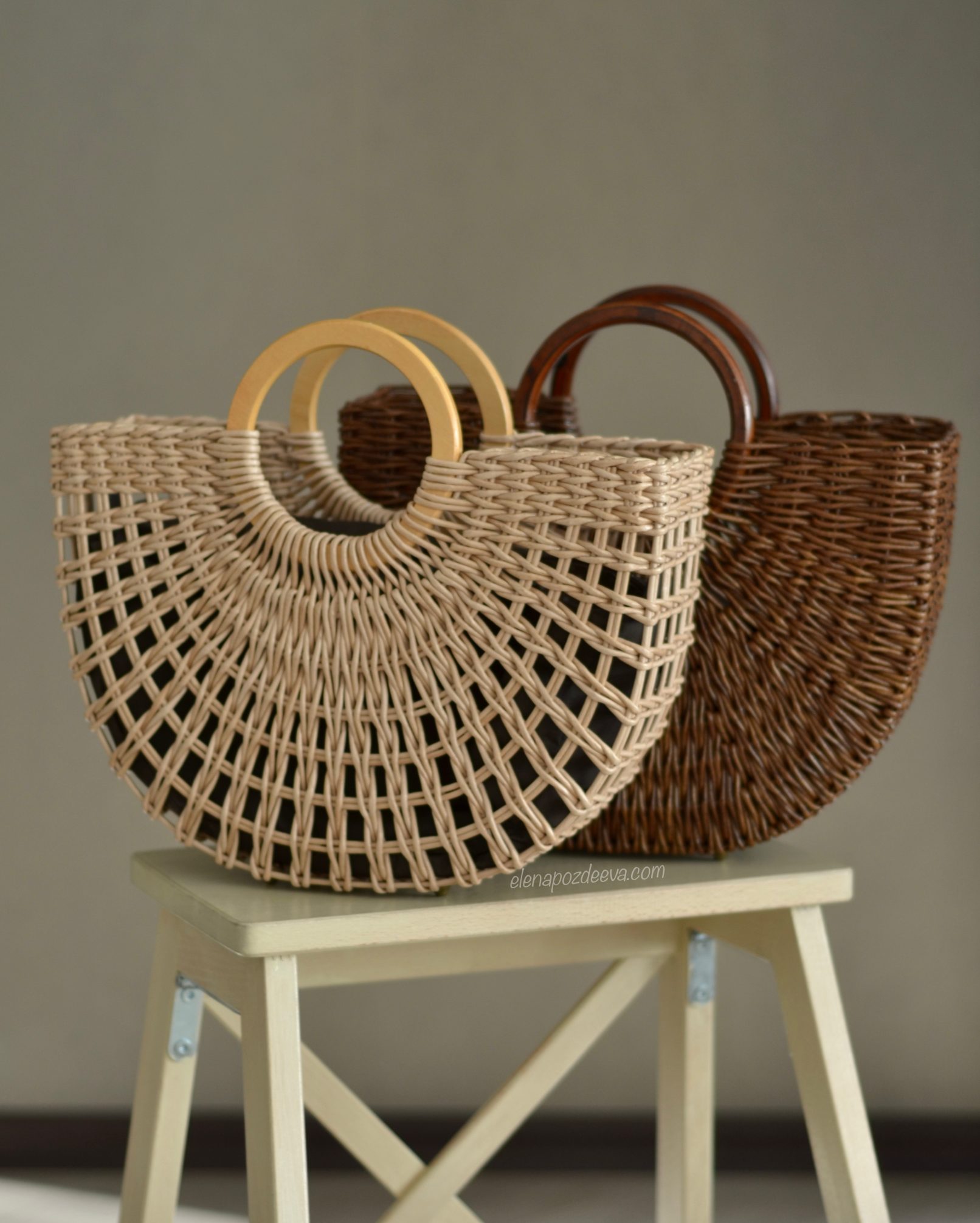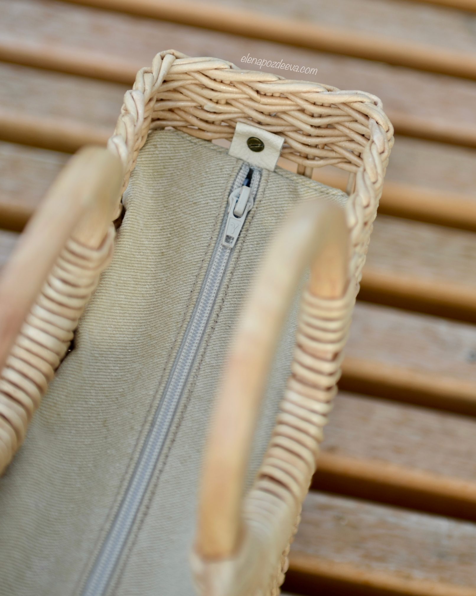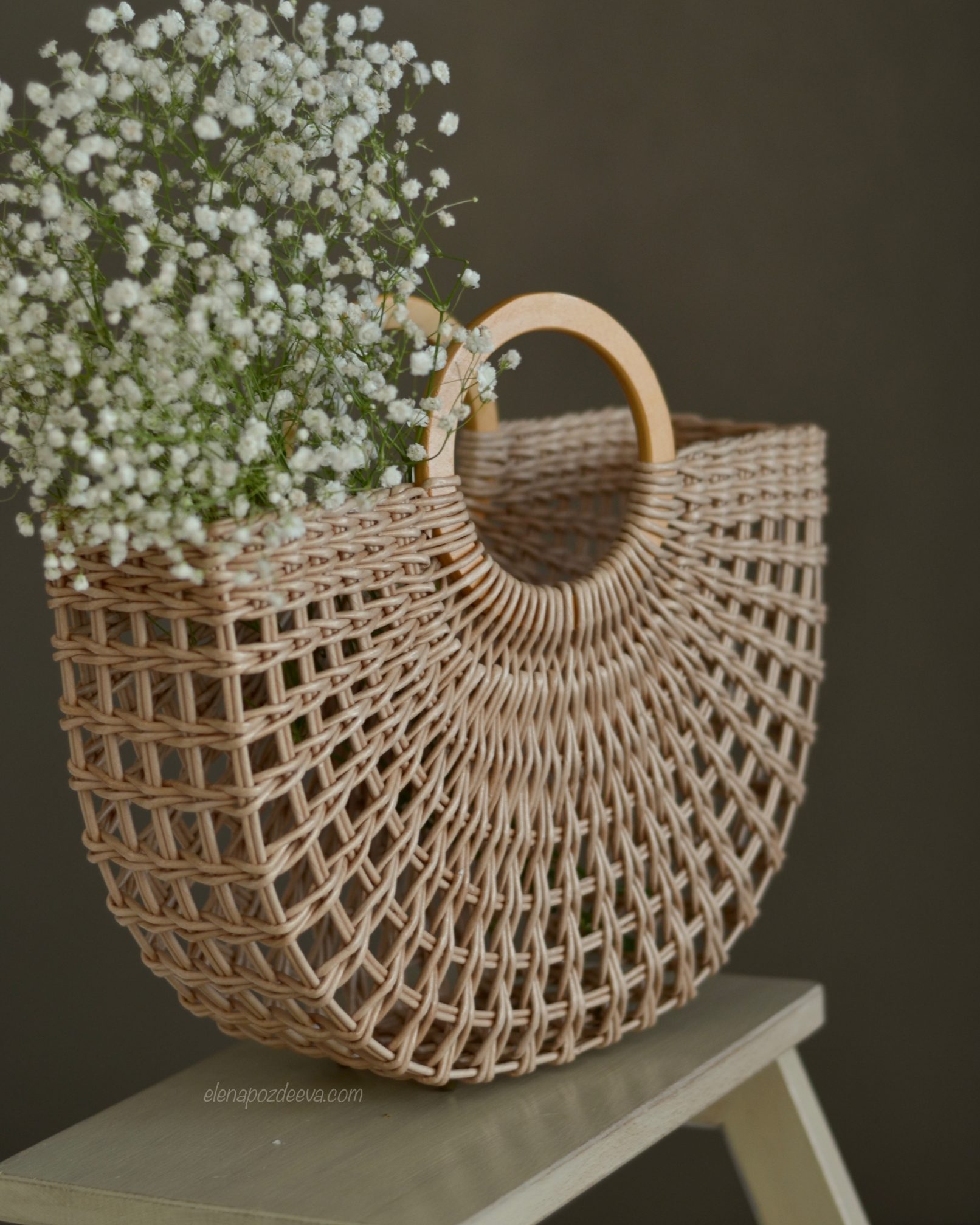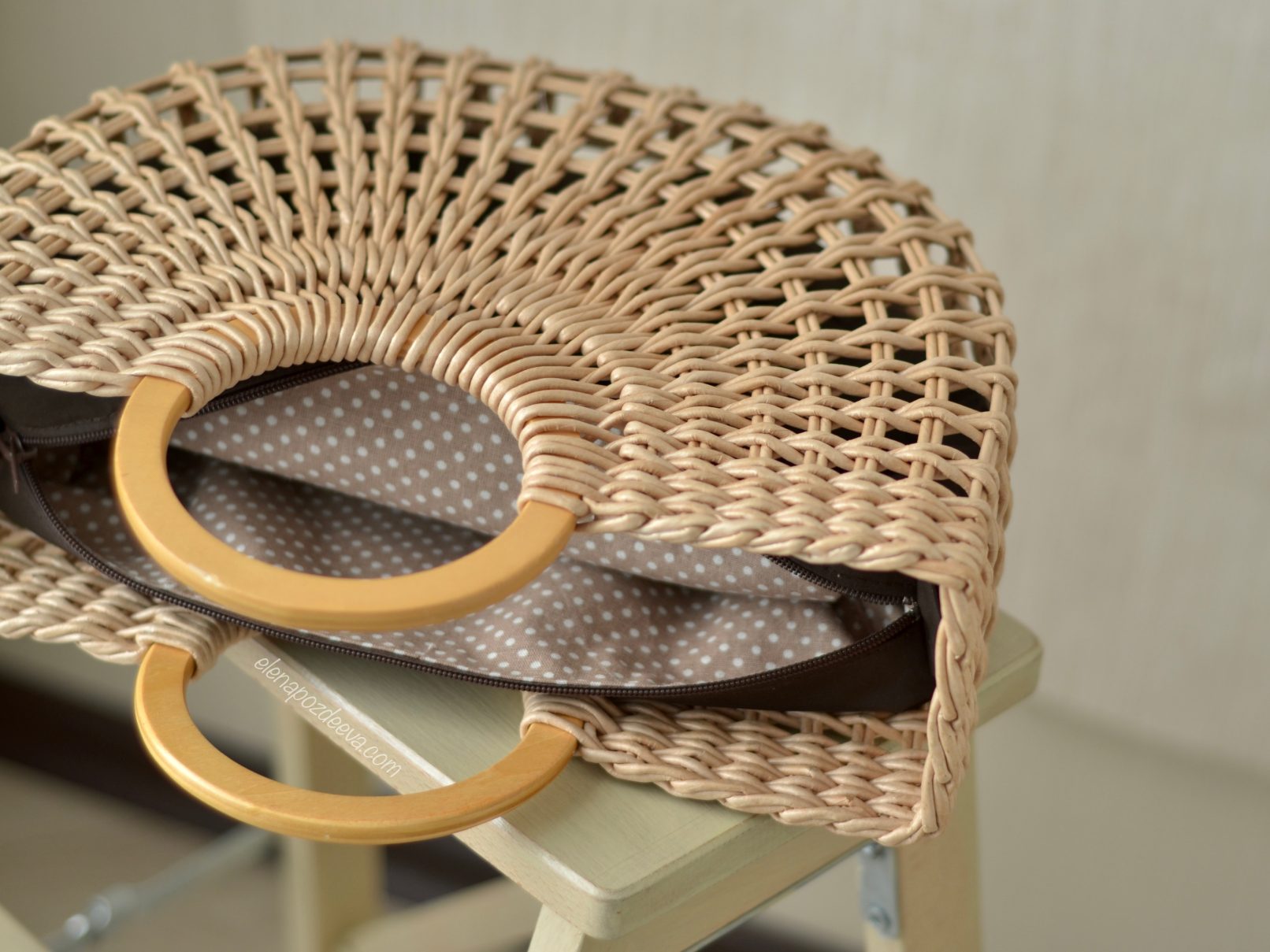 Материалы: имитация лозы, водная морилка, акриловый лак, деревянные ручки, чехол из хлопковой ткани, металлические ножки