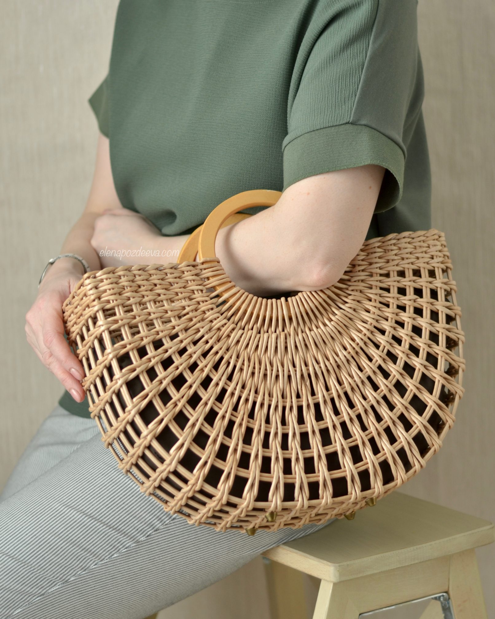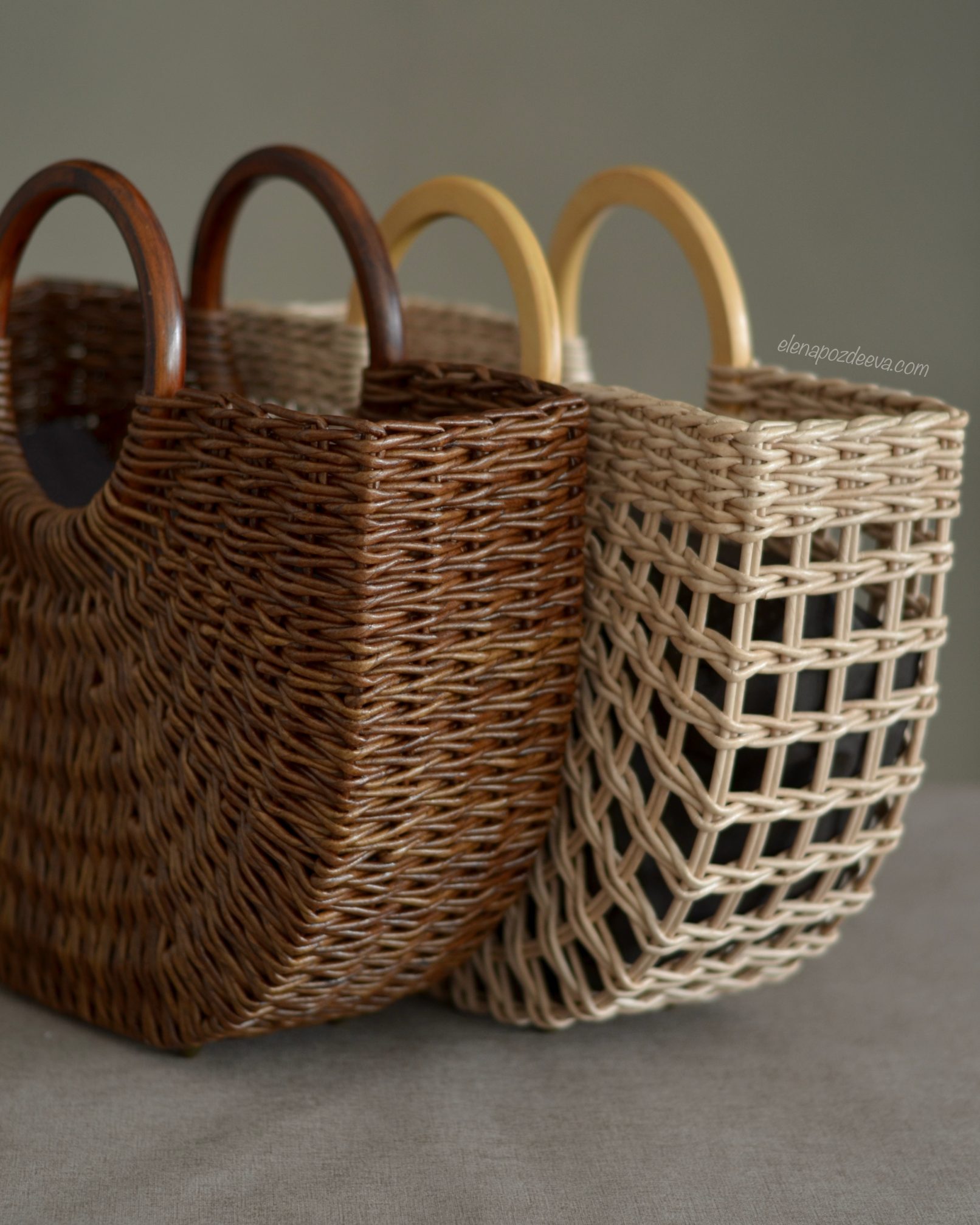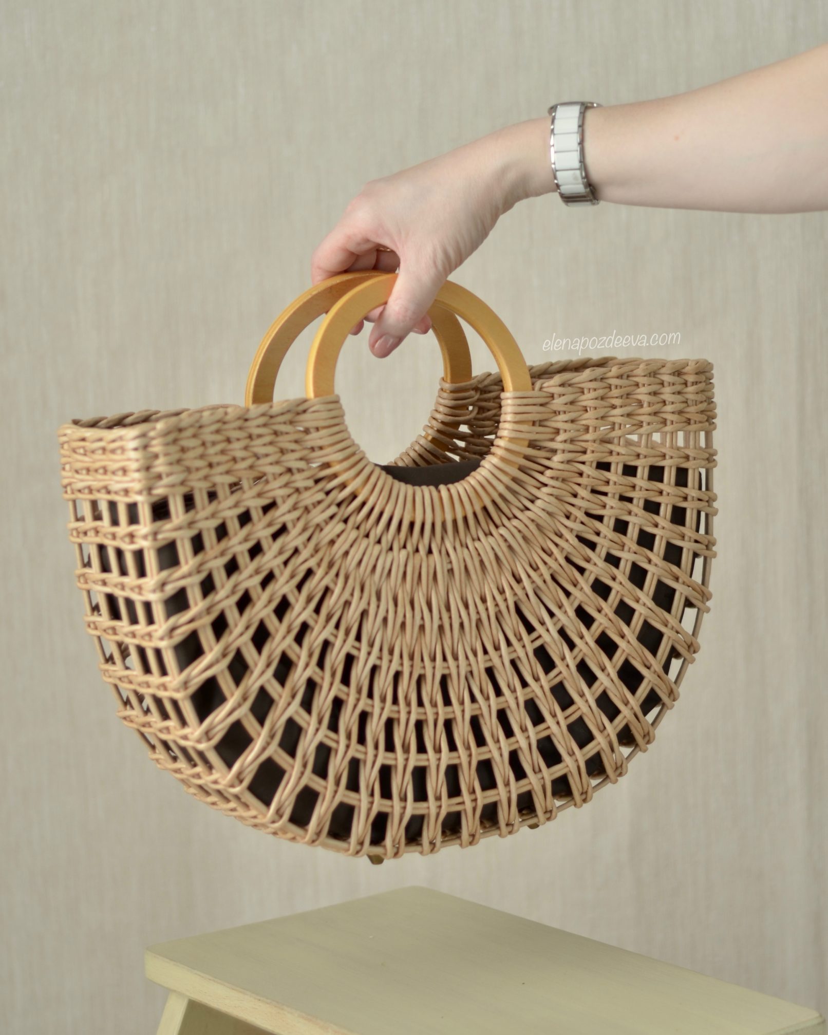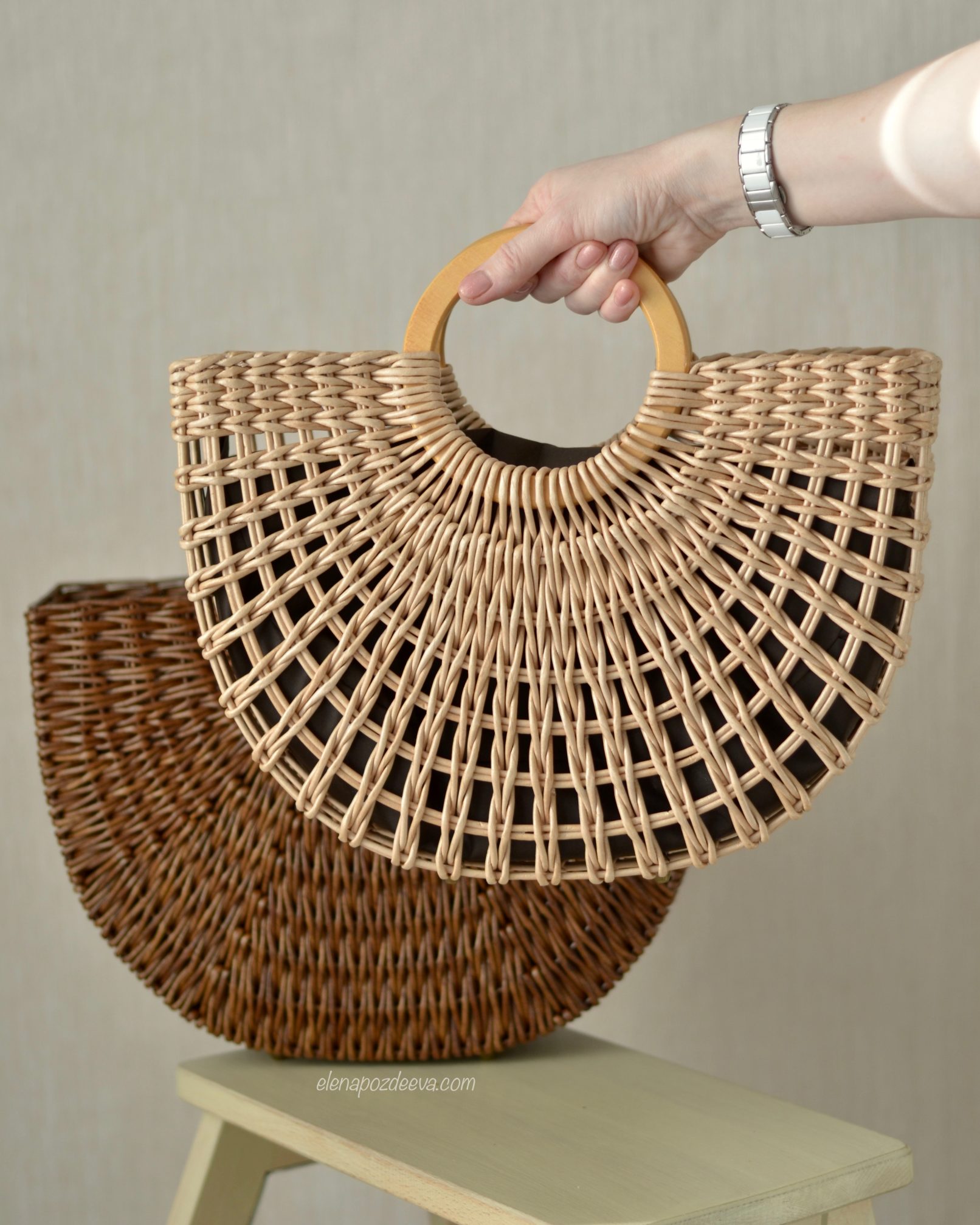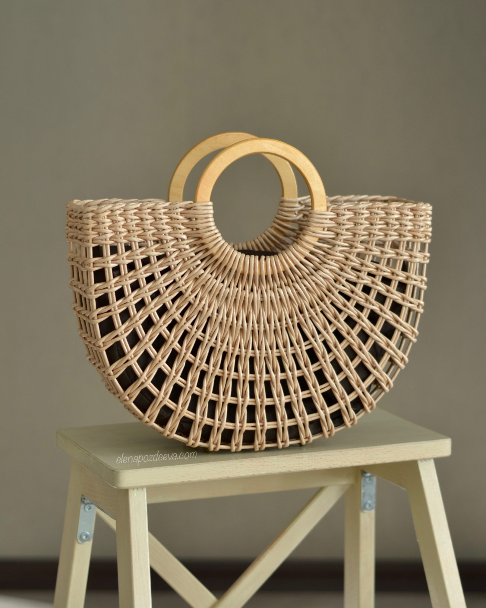 Материалы: имитация лозы, водная морилка, акриловый лак, деревянные ручки, чехол из хлопковой ткани, металлические ножки