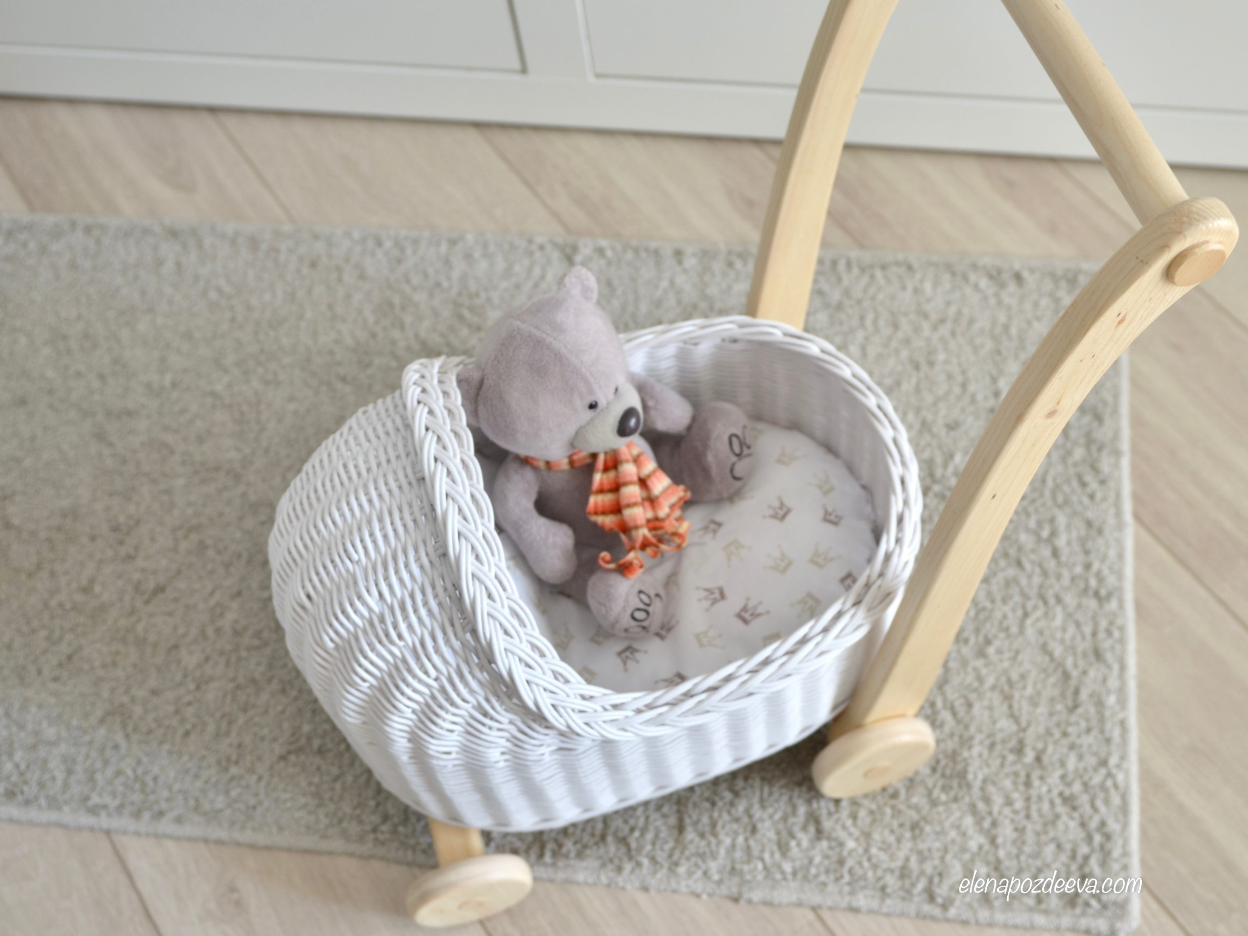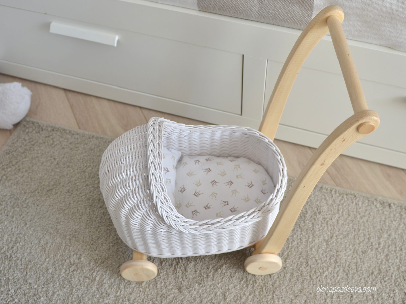 Плетеная колясочка на деревянных колесах, внутри — постельные принадлежности из приятной хлопковой ткани