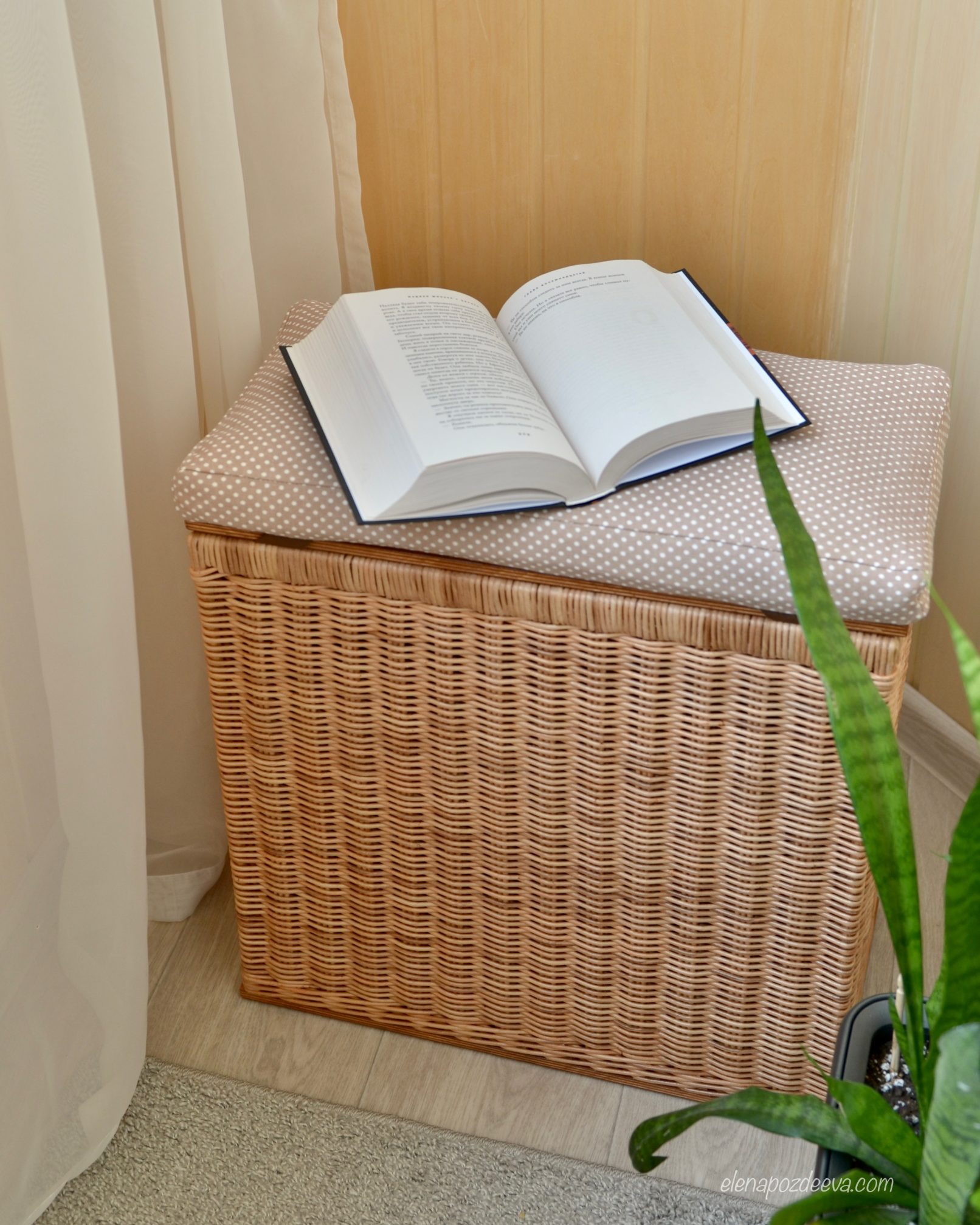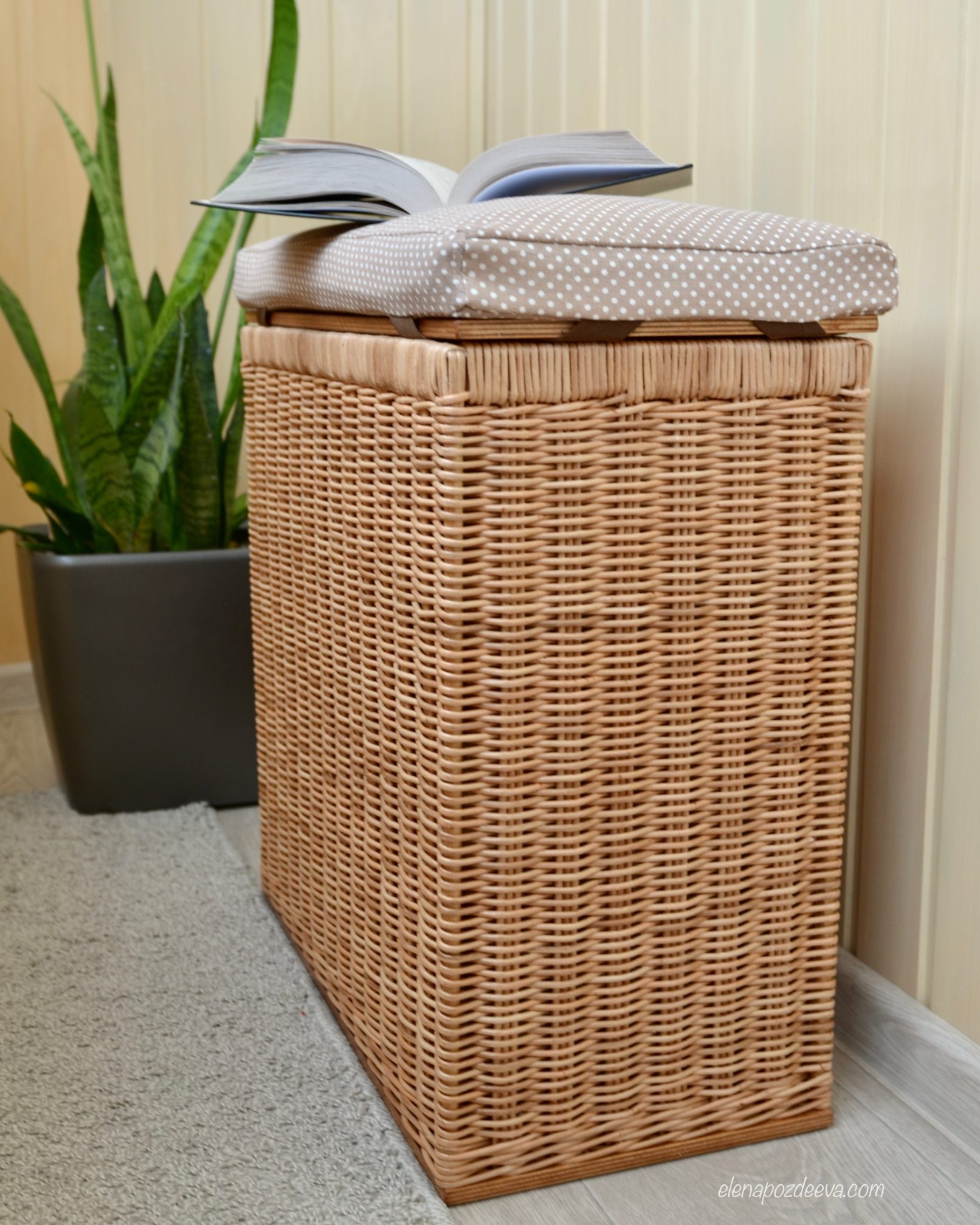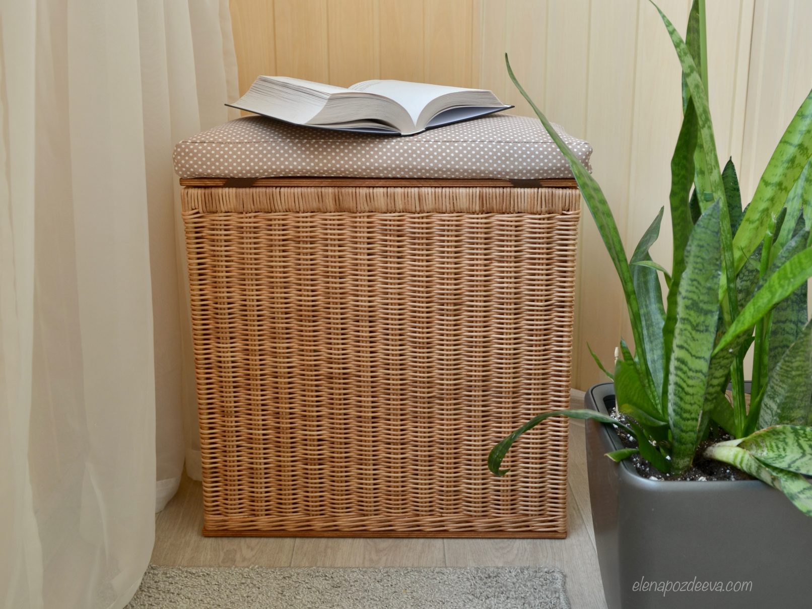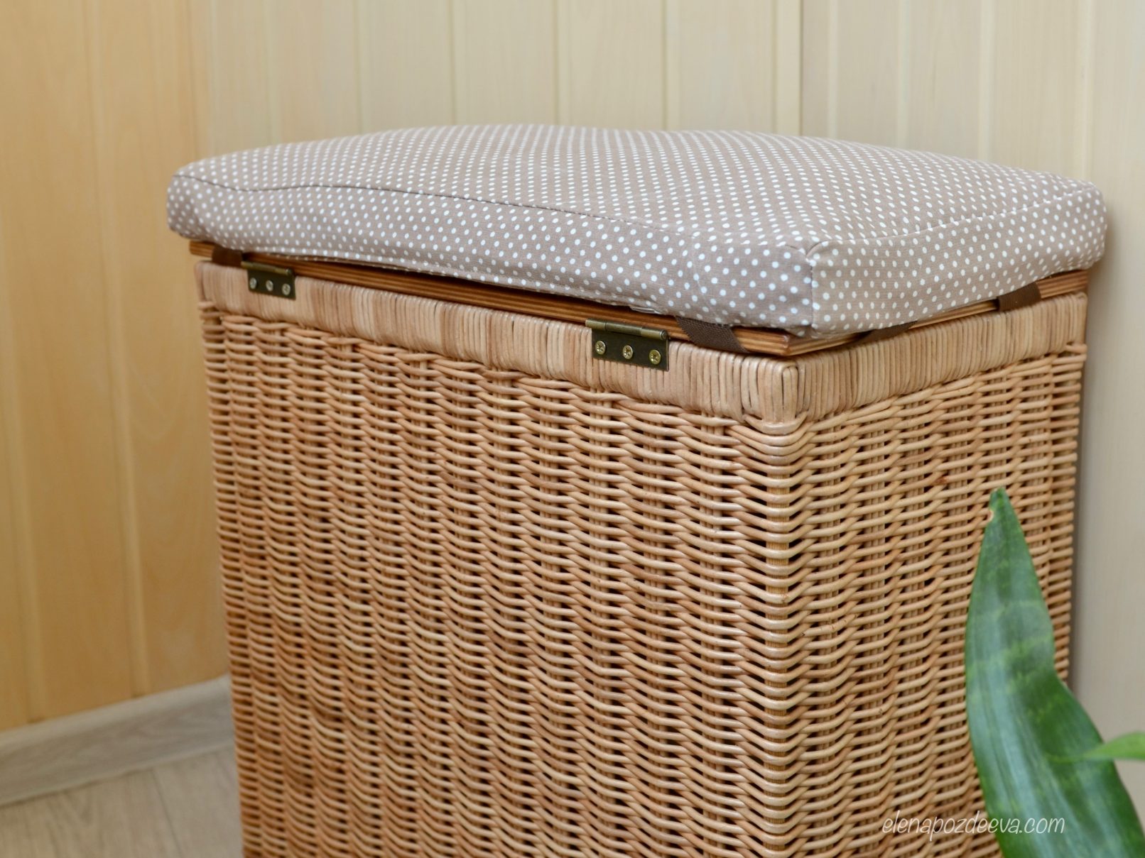 Материалы: имитация лозы, фанера, деревянный профиль, металлическая фурнитура, водная морилка для дерева, акриловый лак, хлопковая ткань, поролон