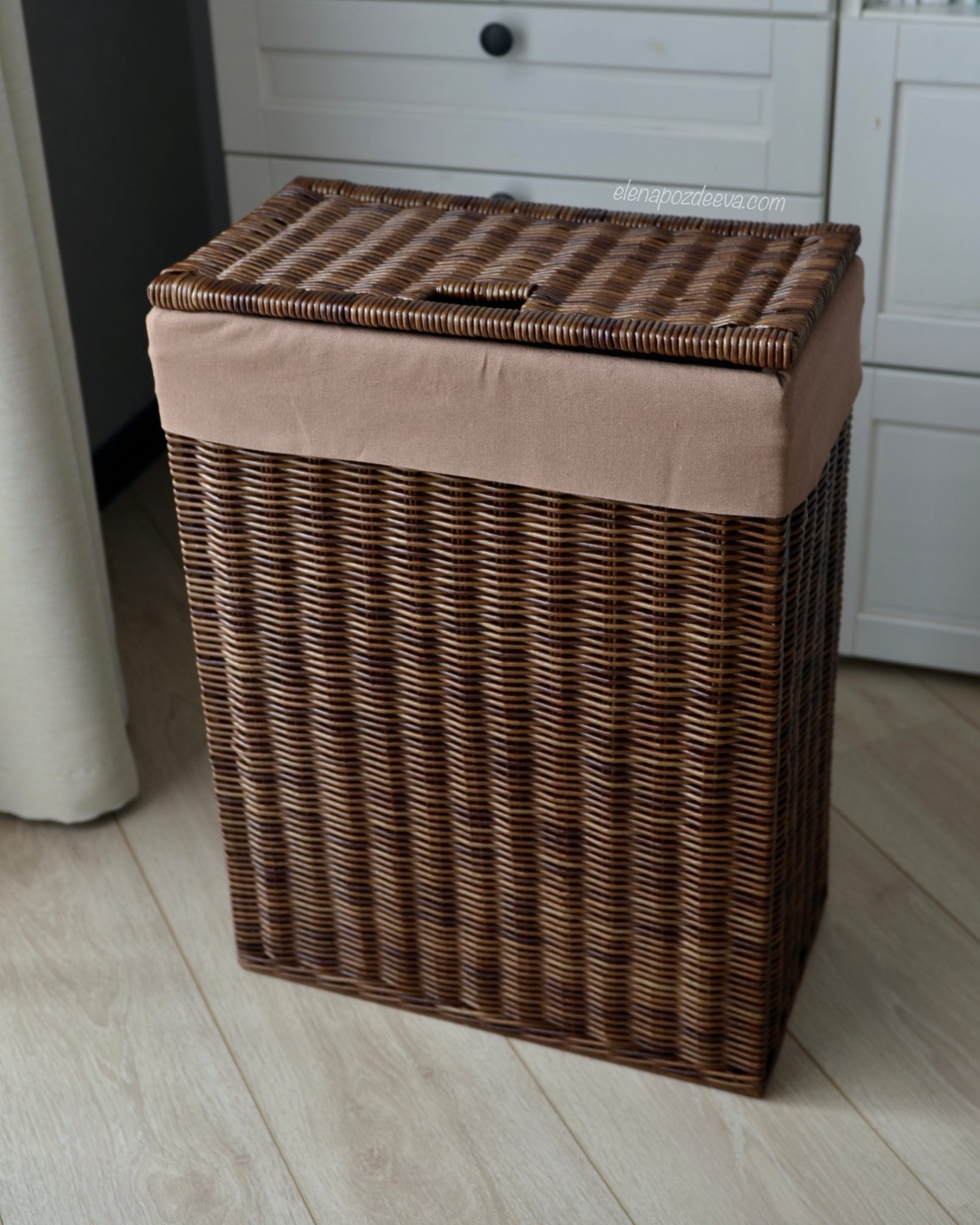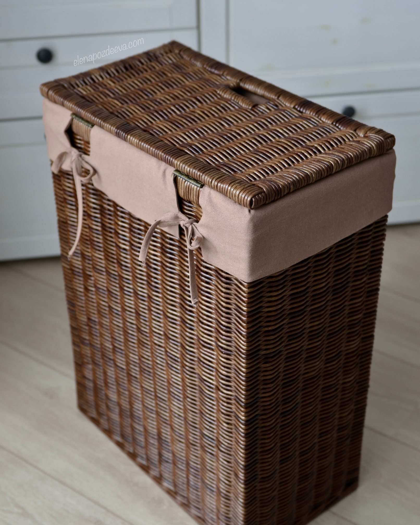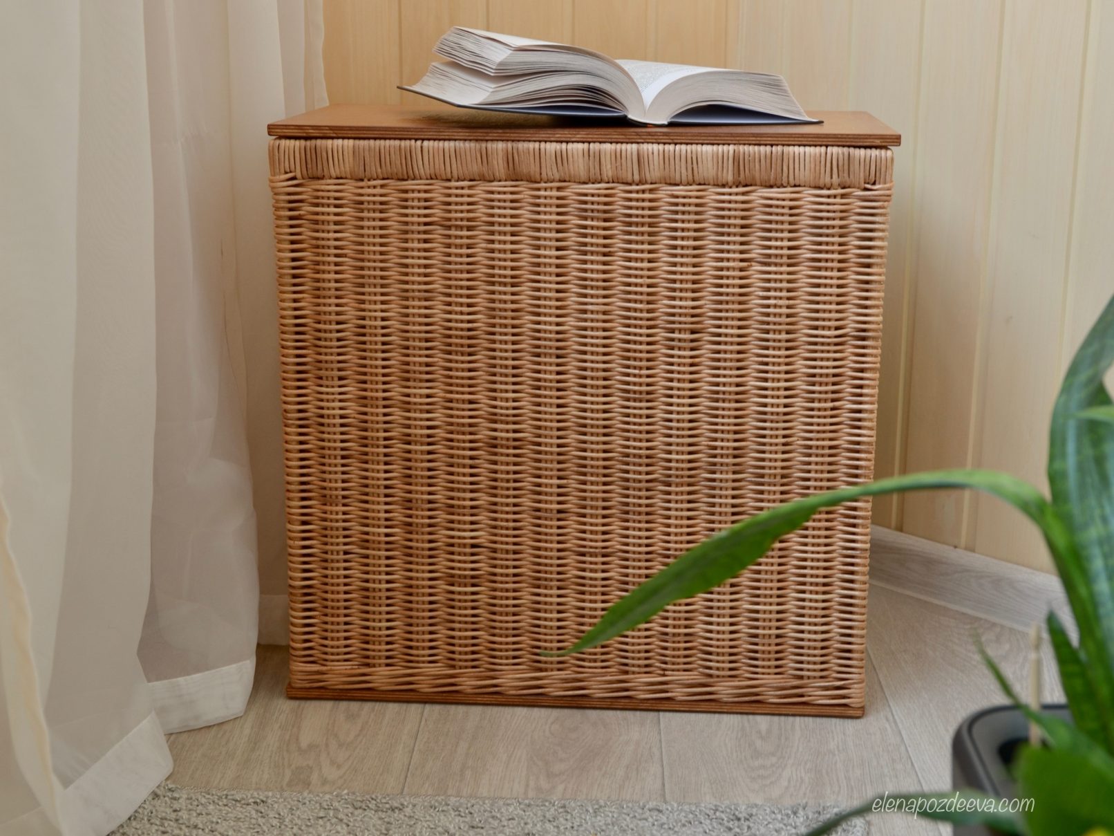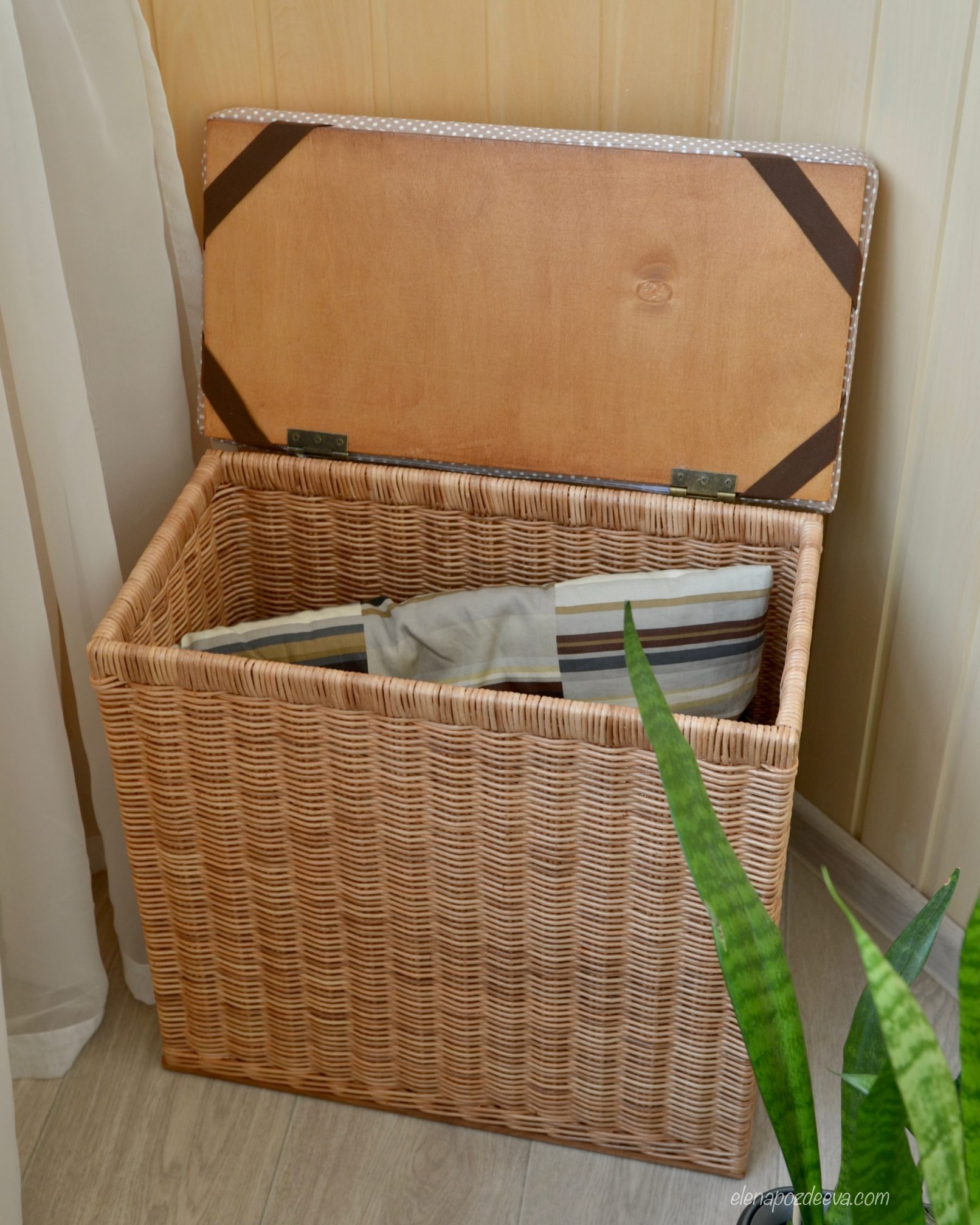 Материалы: имитация лозы, фанера, деревянный профиль, металлическая фурнитура, водная морилка для дерева, акриловый лак, хлопковая ткань, поролон