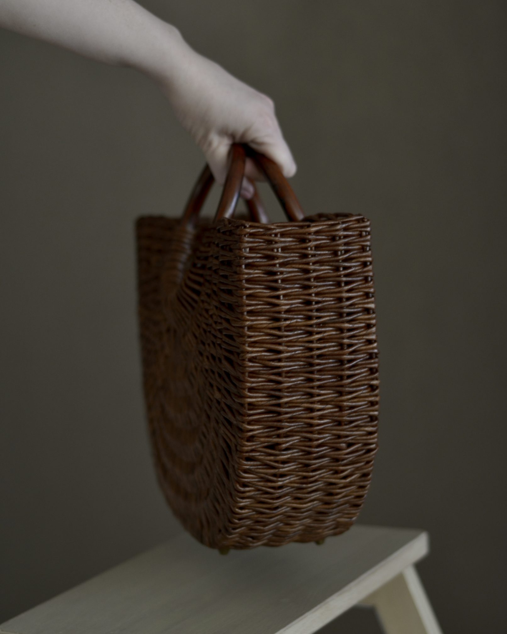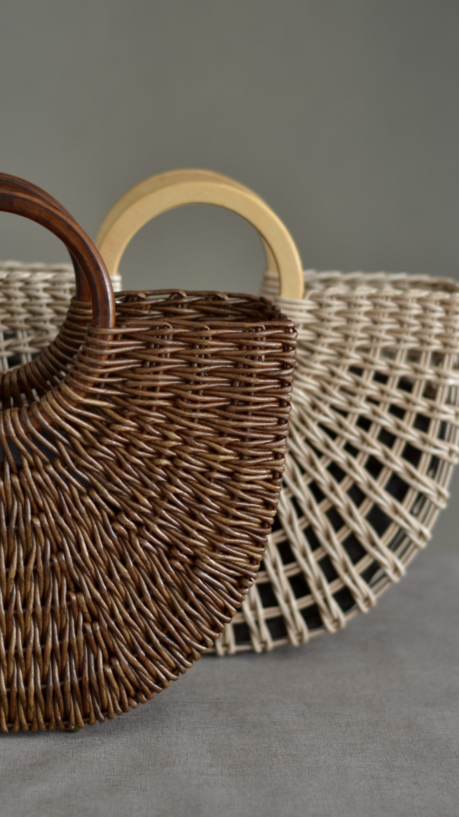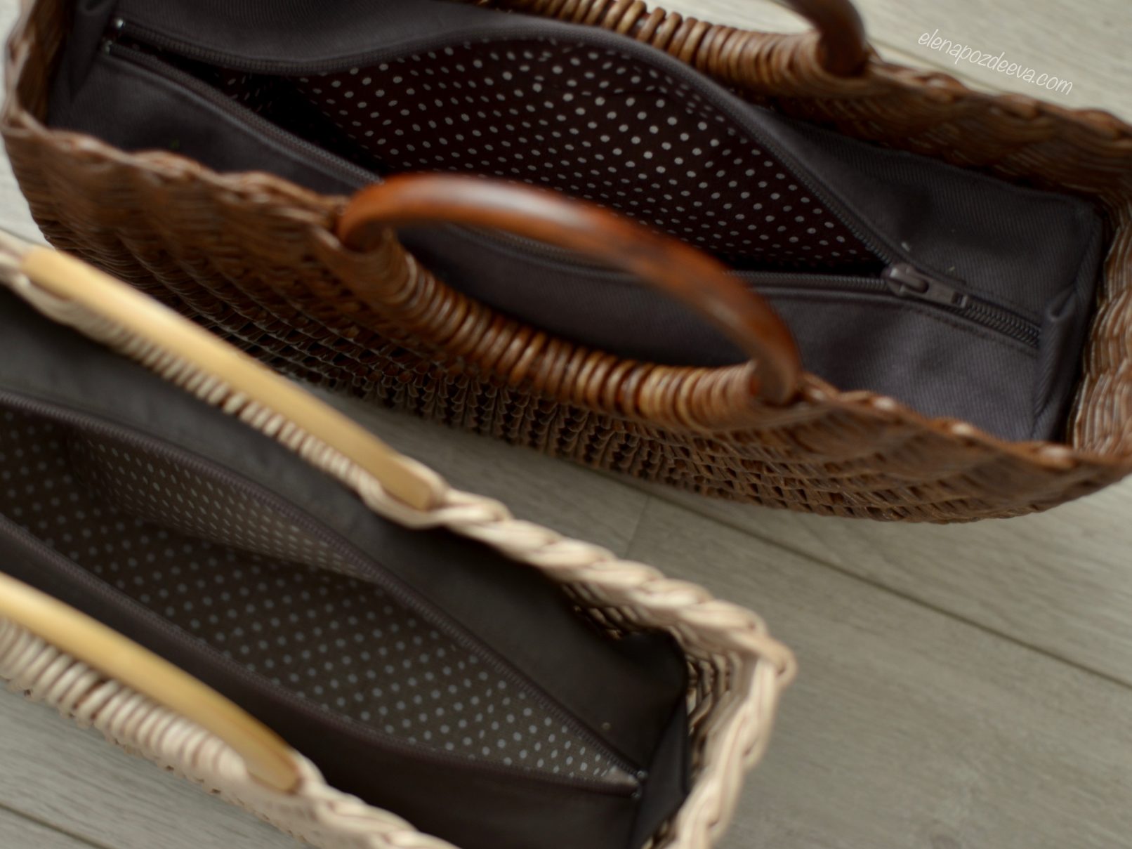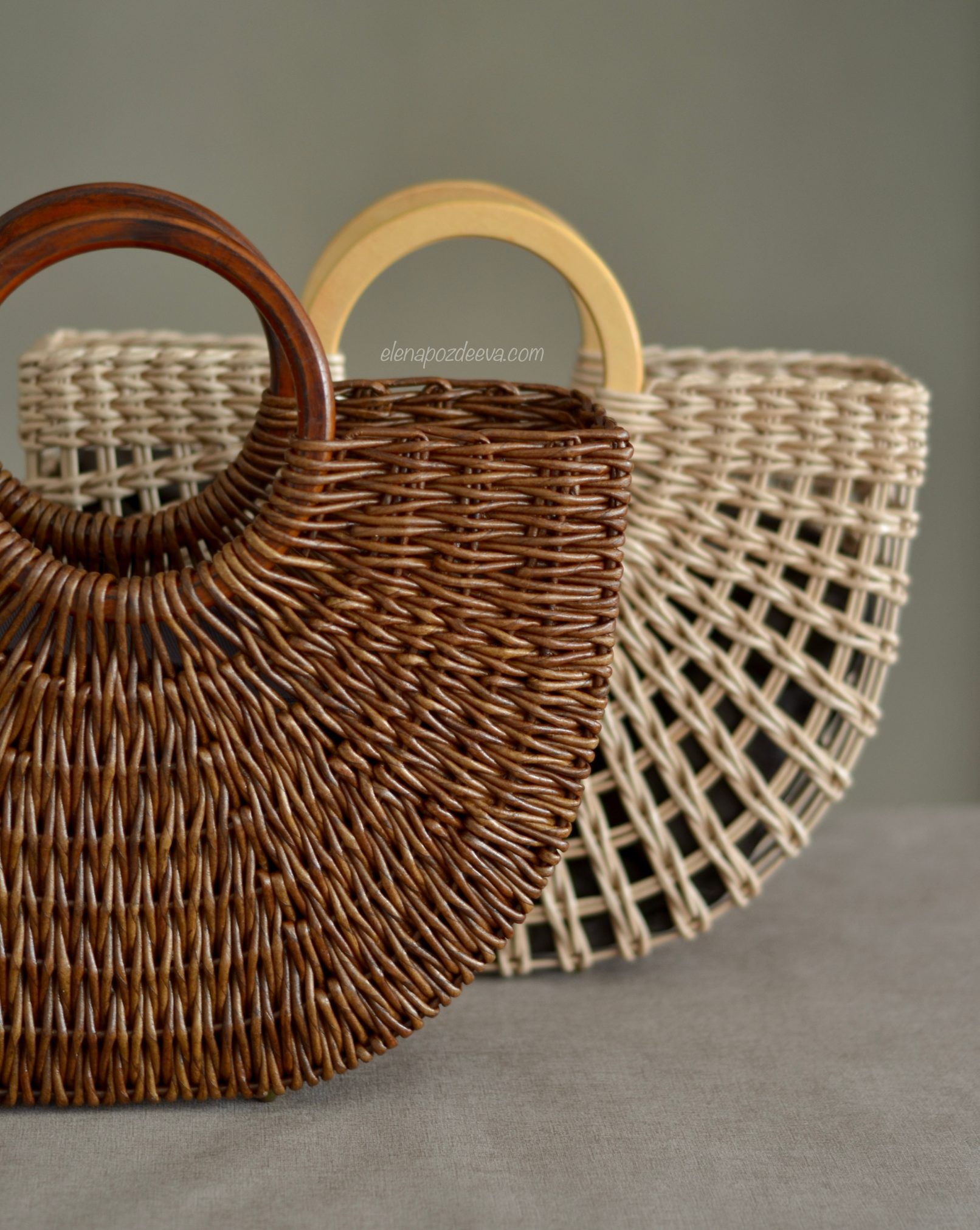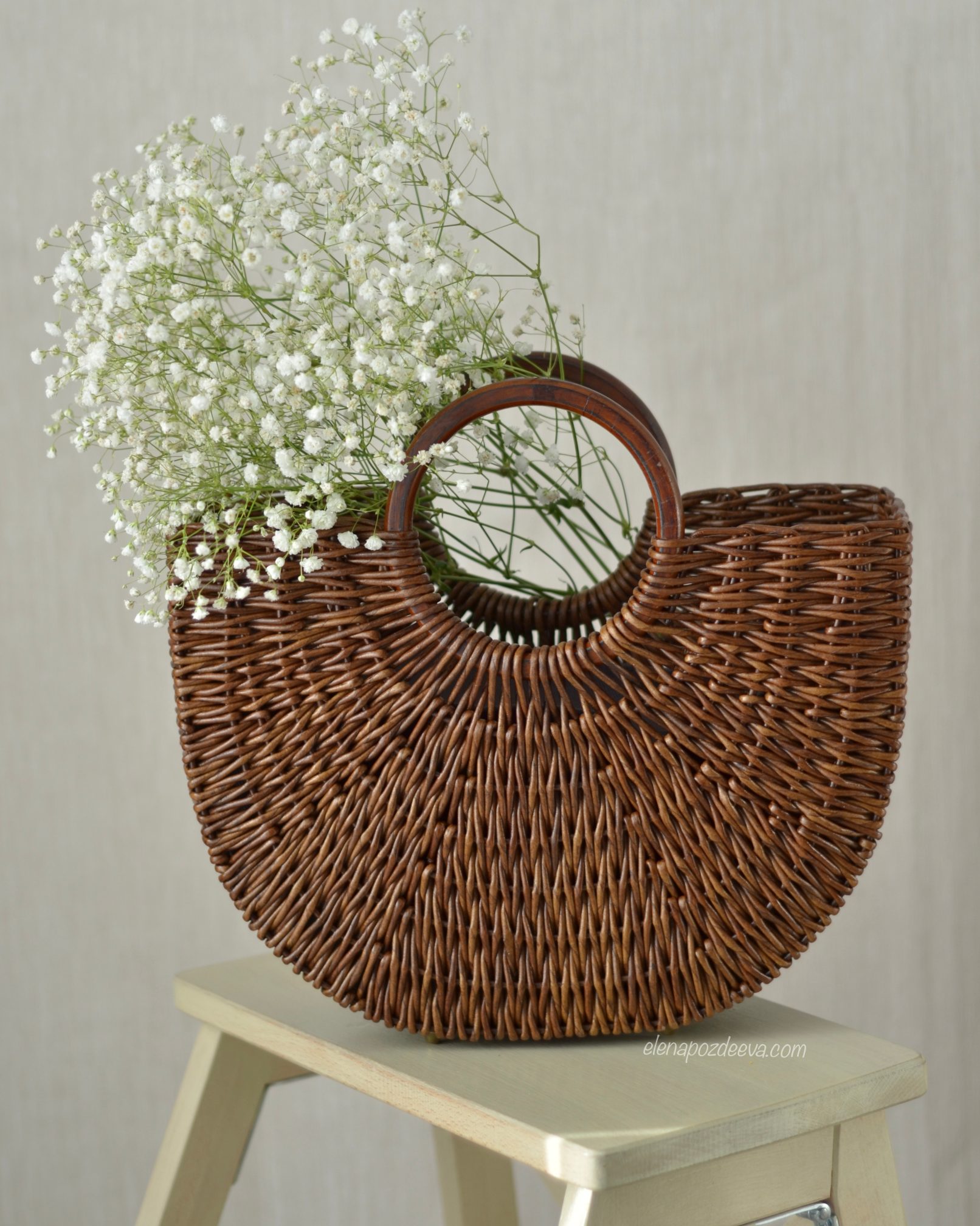 Материалы: имитация лозы, водная морилка, акриловый лак, деревянные ручки, чехол из хлопковой ткани, металлические ножки